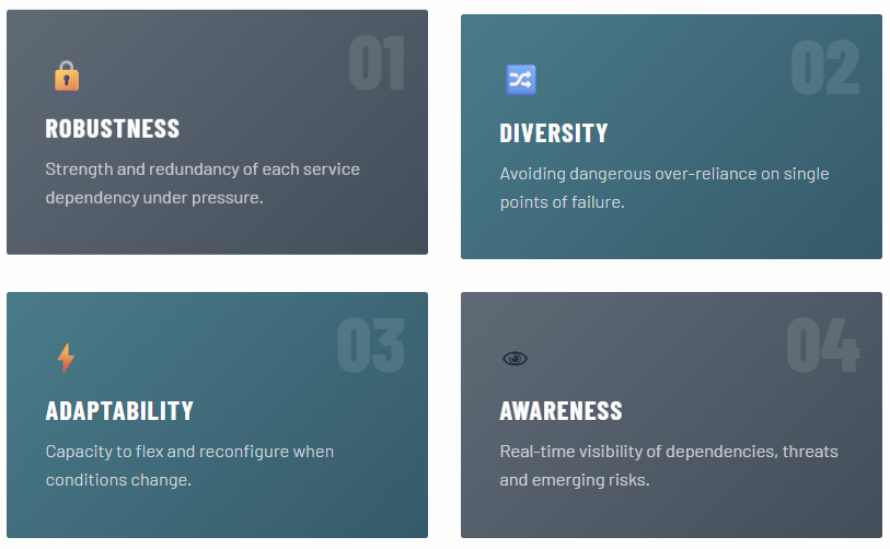 ResBuilder enables Resilience Professionals at the tactical resilience layer — mapping, assessing and evaluating the character of each dependency across key resilience dimensions.